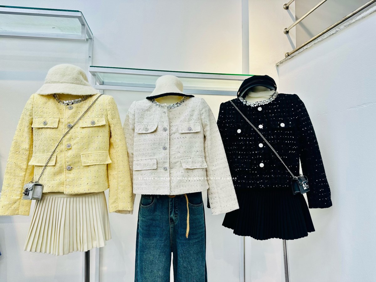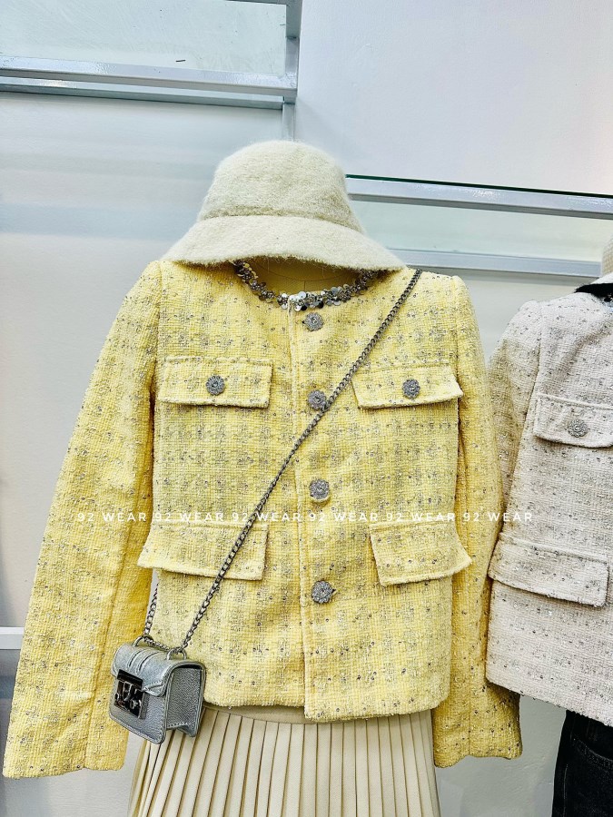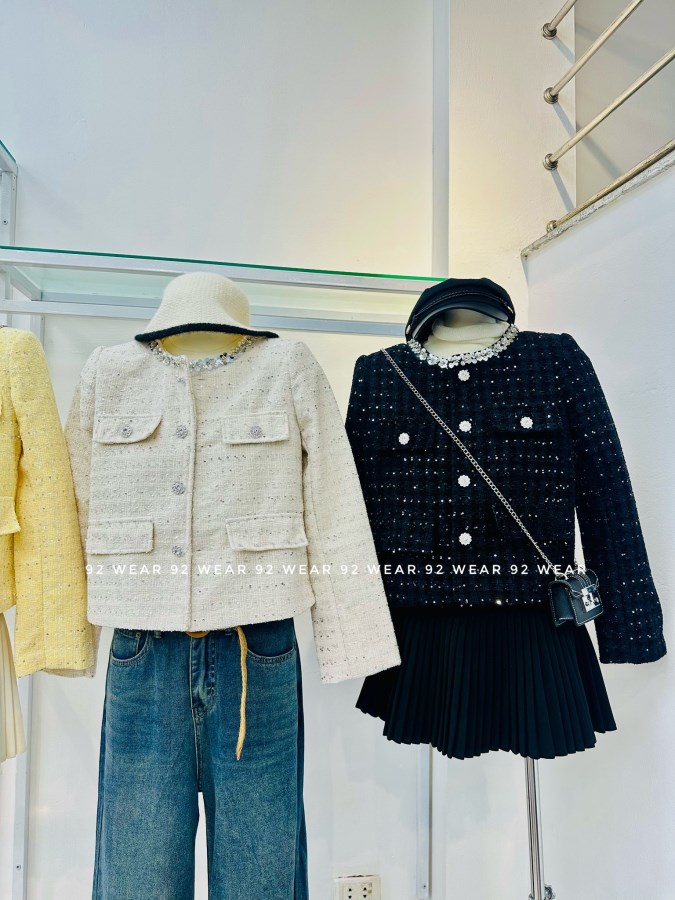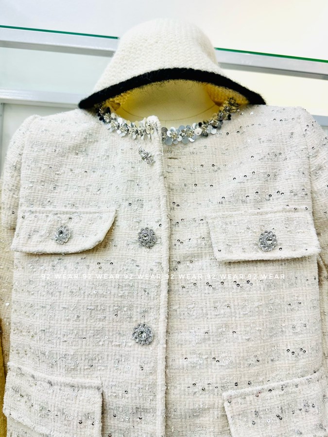 Chất dạ tweed cao cấp, form đứng nhẹ, điểm xuyết nút đá và viền cổ đính ngọc sang trọng – từng chi tiết đều tôn lên vẻ thanh lịch và kiêu kỳ của phái đẹp.